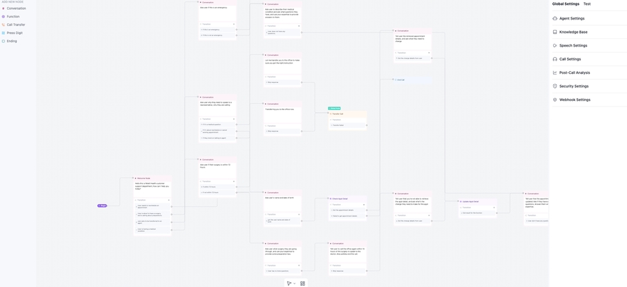 Global Settings: Global settings are settings that apply to the entire conversation. For example, you can set the global prompt, default voice, language, and other agent related settings here.
